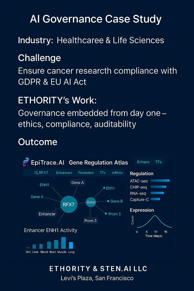 Outcome: A clear, ethically anchored path to operationalize EpiTrace.AI v2x as a next-generation Biomedical Intelligence Platform — previewed in the Gene Regulation Atlas dashboard mockup. This demonstrates governance as an enabler of ETHORITY’s Healing Intelligence approach, where compliance and innovation advance together.